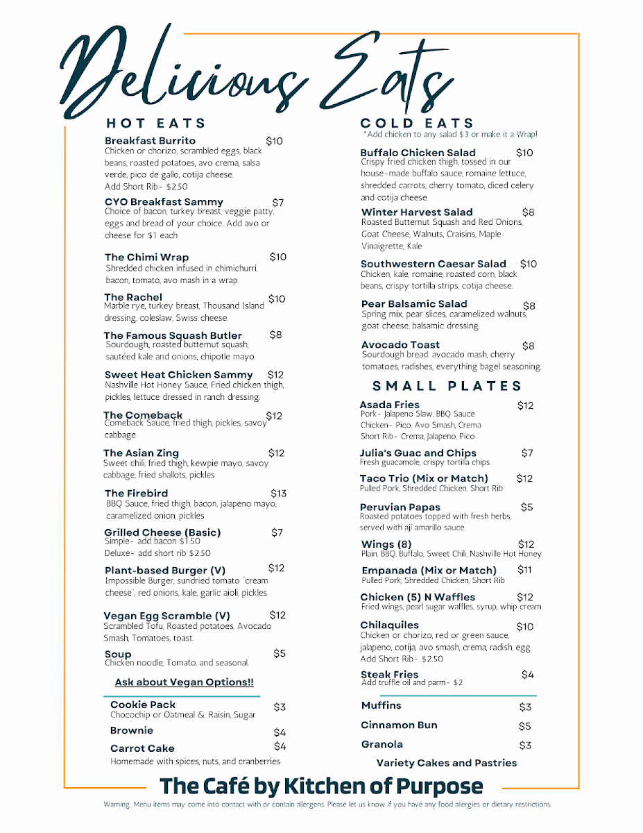 The menu at The Café by Kitchen of Purpose offers a variety of options suitable for breakfast, lunch, and casual dining throughout the day. It is organized into clear sections featuring sandwiches, salads, and combo meals that pair entrees with sides and drinks.